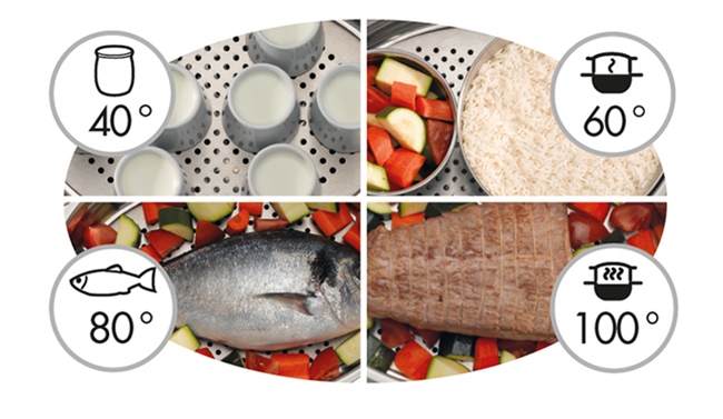 Vapore (100°), Pesce (80°), Scaldavivande (60°), Yogurt (40°).